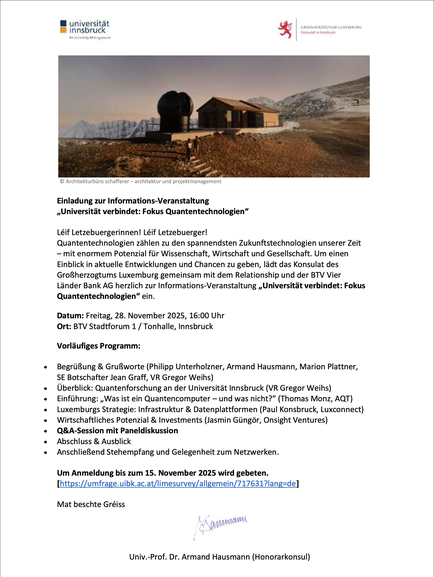 Den 9. Oktober 2024 huet Abteilung vum Relationship Management vun der Universitéit Innsbruck an den lëtzebuerger Honorarkonsul zesumme op Netzwerktreffen "Universität Innsbruck verbindet - Luxemburg im Fokus" agelueden. Nieft de léiwen Grußworte vum Vizerektor fir Fuerschung Univ.-Prof. Dr. Gregor Weihs, der Landestagspräsidentin Sonja Ledl-Rossmann an eisem lëtzebuerger Honorarkonsul Monsieur Armand Hausmann, konnt een sech ob e spannende Virtrag vum letzebuerger Ambassadeur vu Wien SE Jean Graff freeën, wou iwwert déi wirtschaftlech Entwécklung vu Lëtzebuerg geschwat gouf a wei eng bedeite Relatioune Lëtzebuerg mam Bundesland Tirol an Éisträich huet.